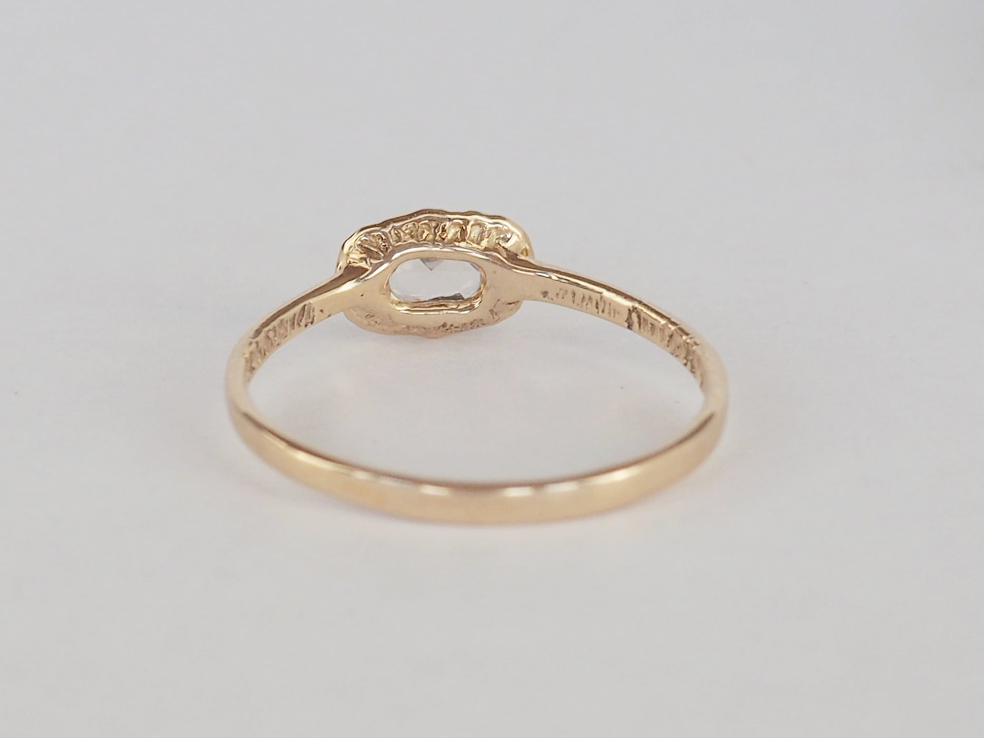指に引いた金の帯(バンド)をダイヤモンドをキュッと締めて留めました。
